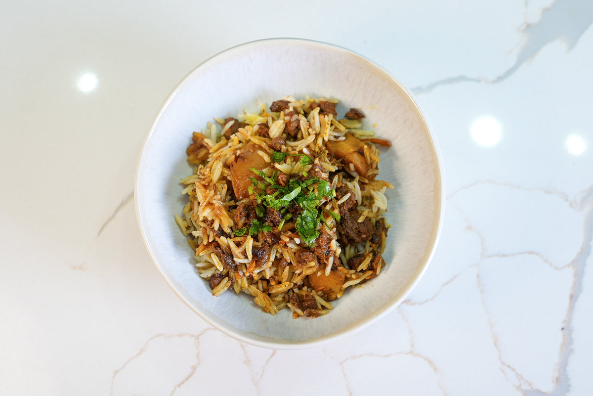 Hearty ground beef & potatoes packed with bold spices, served over fragrant rice. Pure comfort, Saffa style!
